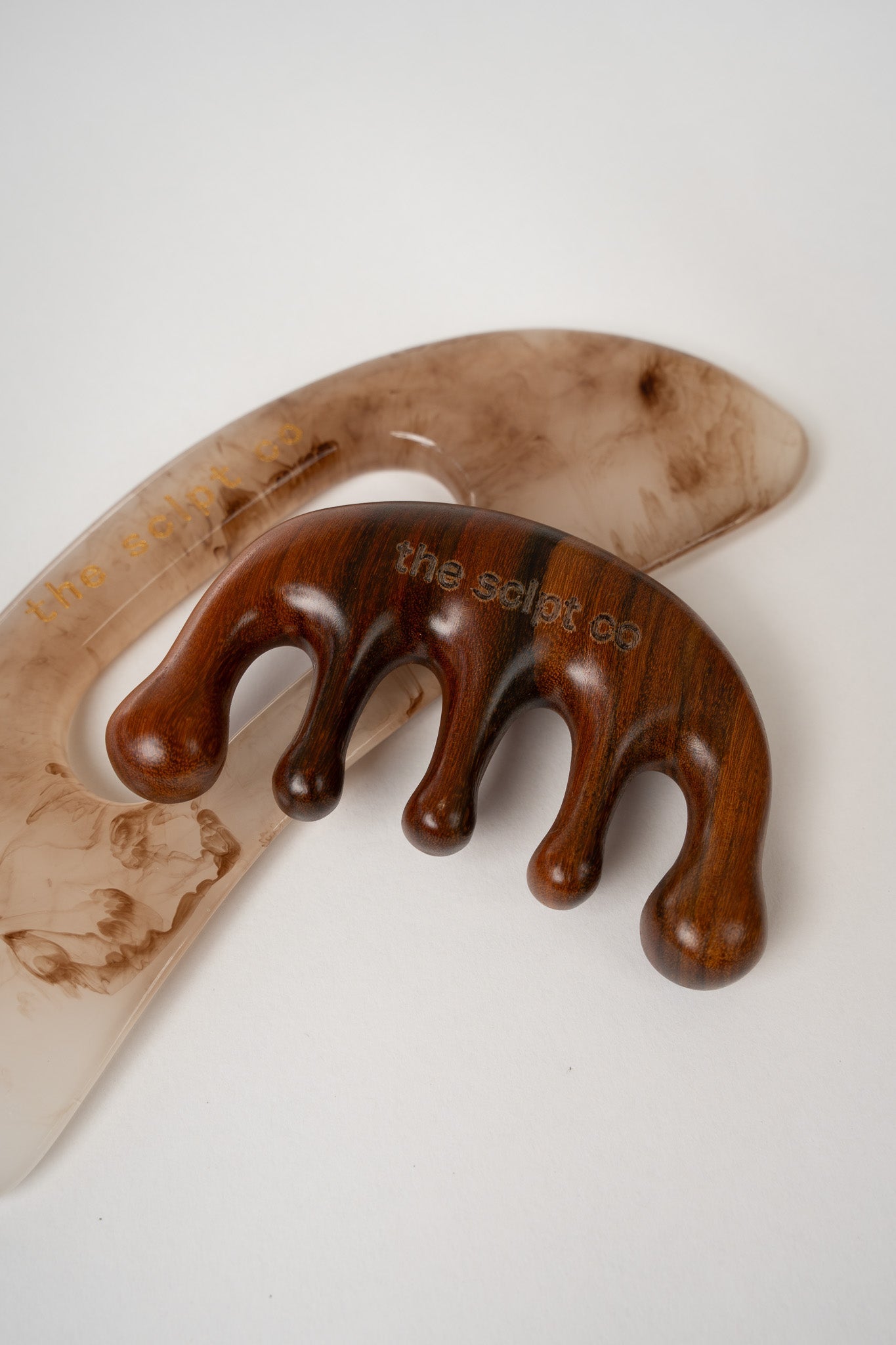 Enhance your wellness routine with this Gua Sha Body Set. Designed to stimulate energy flow throughout the body, release muscle tension and encourage lymphatic drainage. You will experience a more relaxed and refreshed self integrating this ritual into your routine. This set includes a wooden comb and eco-resin body fascia releaser. A lightweight combo to focus on multiple angles of the body. Paired best with the sclpt balm.